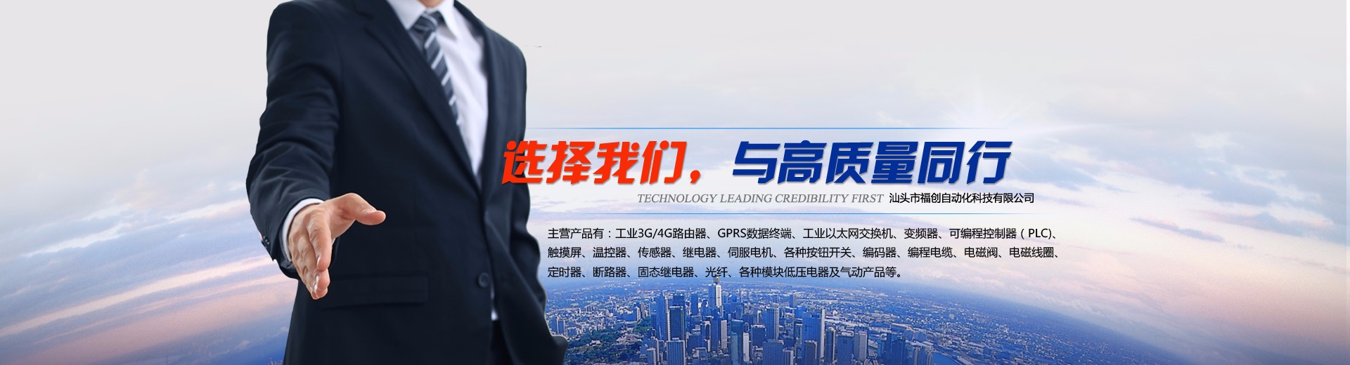 汕頭市福創(chuàng)自動(dòng)化科技有限公司是一家集自動(dòng)化元件的代理銷(xiāo)售與維修、自動(dòng)化設(shè)備設(shè)計(jì)制造、自動(dòng)化工程安裝改造、機(jī)電工程安裝改造、自動(dòng)化機(jī)械設(shè)備設(shè)計(jì)與制造的企業(yè)。  主營(yíng)產(chǎn)品有:工業(yè)3G/4G路由器、GPRS數(shù)據(jù)終端、工業(yè)以太網(wǎng)交換機(jī)、變頻器、可編程控制器(PLC)、觸摸屏、溫控器、傳感器、繼電器、伺服電機(jī)、各種按鈕開(kāi)關(guān)、編碼器、編程電纜、電磁閥、電磁線圈、定時(shí)器、斷路器、固態(tài)繼電器、光纖、各種模塊低壓電器及氣動(dòng)產(chǎn)品等。
